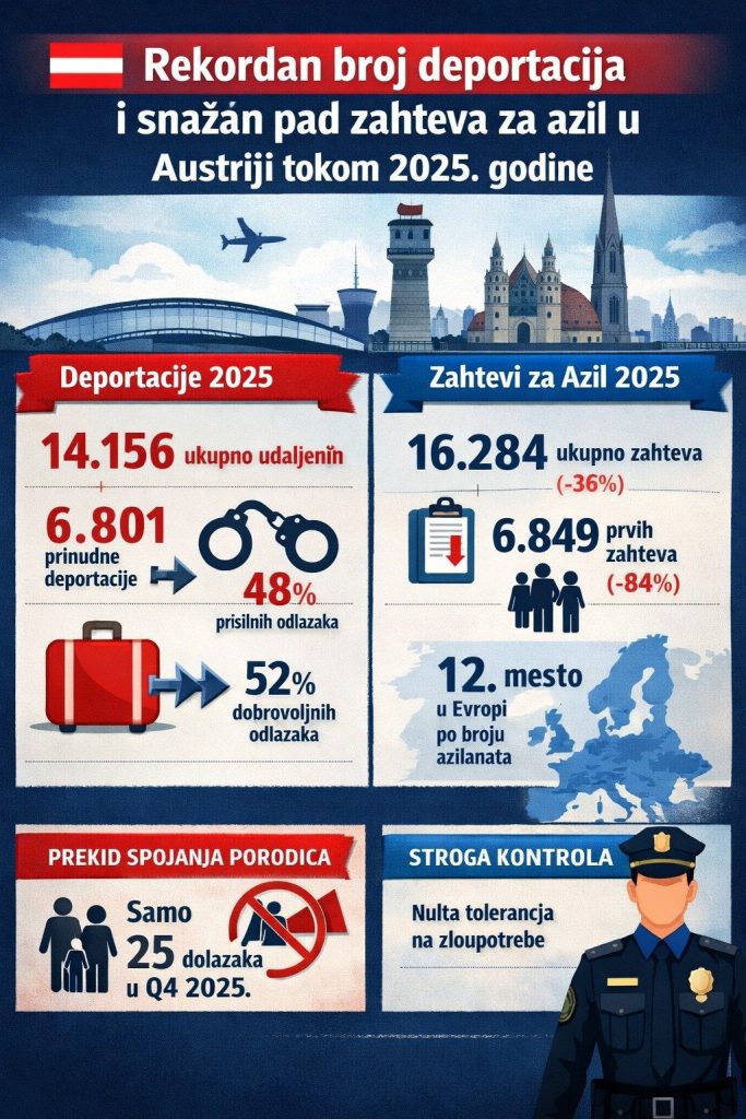 Prema podacima Ministarstva unutrašnjih poslova i Kancelarije za strance i azil (BAF – Bundesamt für Fremdenwesen und Asyl), tokom prošle godine sproveden je najveći broj deportacija od početka vođenja evidencije, dok je istovremeno zabeležen snažan pad broja zahteva za azil.